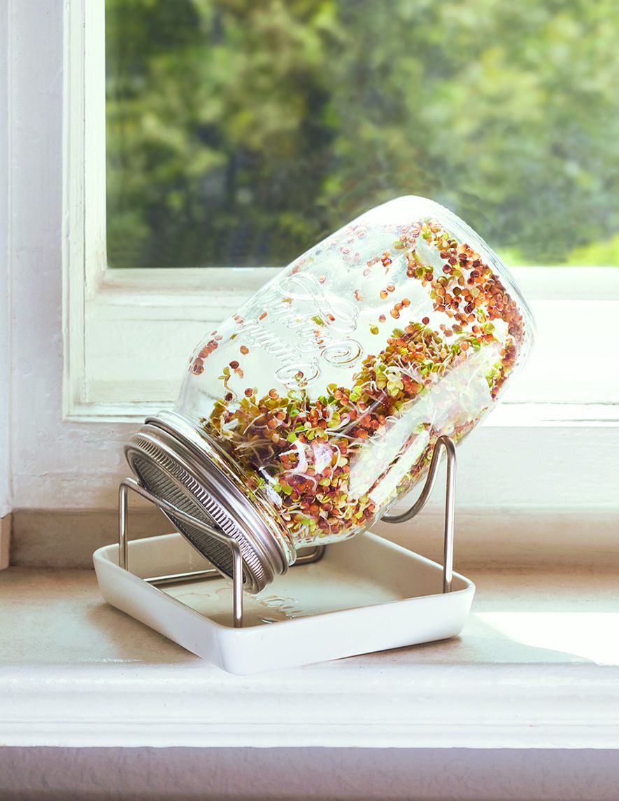 Ganzjährig verfügbar, gedeihen Sprossen, Keimlinge und Microgreens überall – ob auf der warmen Fensterbank oder im praktischen Keimapparat. Es ist ganz einfach, sie selbst zu ziehen. Das einfachste System ist das Keimen in einem Keimglas. Das Glas sollte mit einem Edelstahldeckel verschlossen werden. Bei Keimgläsern aus Kunststoff machen sich schnell Bakterien, Viren und Schimmelpilze breit. Dann benötigen Sie nur noch die gewünschten Samen und Wasser. Und schon kann es losgehen. Der Keimvorgang besteht aus der Einweichphase, etwa 3 Spül- und Abtropftage und der Lagerphase.