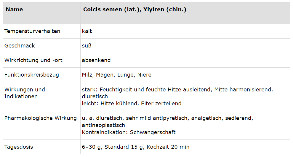 Bei Husten mit weißem Schleim und Kurzatmigkeit lindert die Ingwer-Essenz mit reifer Mandarinenschale (Rezept s. Kasten). Gekochte Hiobstränensamen (Tab. 4) wirken sehr stark gegen Schleim und Eiter und fördern die Diurese. Bei der Auswahl aus den Lebensmittelgruppen und Zubereitungsweisen sollten schleimbegünstigende durch schleimreduzierende ersetzt werden (Übersicht s. Tab. 5).