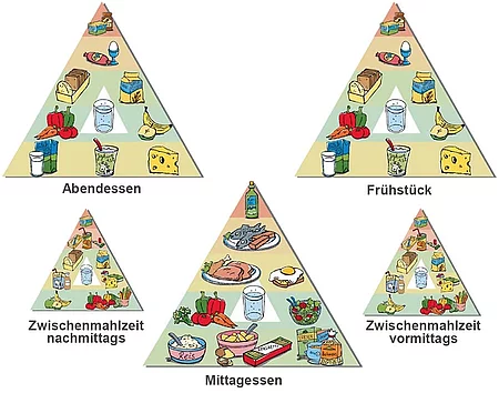 Mit 3 Hauptmahlzeiten und 2 Zwischenmahlzeiten am Tag lässt sich die Optimierte Mischkost praxisnah umsetzen [Abb. 3].