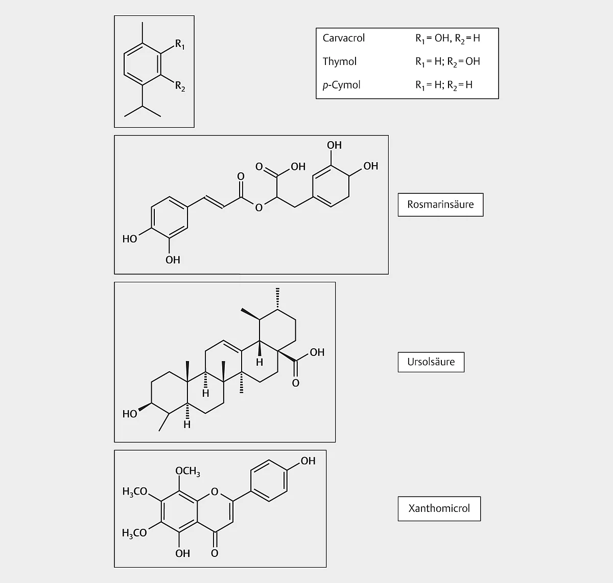 Als Lamiacee enthält O. dictamnus ein ätherisches Öl, das durch Wasserdampfdestillation gewonnen wird und gelb gefärbt ist; der Gehalt liegt bei bis zu 2,5% (m/m) und ist während der Blütezeit am höchsten [2] [23] [31]. Seit 1966 wurde immer wieder das ätherische Öl untersucht [31]. In einer sehr frühen Untersuchung wurde festgestellt, dass Carvacrol der Hauptbestandteil des ätherischen Öls ist [26]. Beim Wildtyp werden heute hinsichtlich der Zusammensetzung des ätherischen Öls zwei O. dictamnus-Chemotypen unterschieden, der Carvacrol- und der Thymol-Chemotyp. Eindeutig vorherrschend ist der Carvacrol-Chemotyp mit den Komponenten Carvacrol (ca. 50–80%), p-Cymol (ca. 6–10%), γ-Terpinen (ca. 8–9%) und weiteren Komponenten mit Monoterpen-Struktur, insbesondere Monoterpen-Kohlenwasserstoffe [1] [23]. Nur wenige Arbeiten haben über den Thymol-Chemotyp berichtet, in dem Thymol mit 62–76% die Hauptkomponente ist, gefolgt von Carvacrol (4–12%) [9]. Interessant ist auch, dass das ätherische Öl der Winterblätter hauptsächlich p-Cymol (60%), Borneol (9%), Carvacrol (8%) und γ-Terpinen (ca. 0,9%) enthält und sich damit auch hinsichtlich der Zusammensetzung des ätherischen Öls von den Sommerblättern unterscheidet [18]. Charakteristische Inhaltsstoffe in O. dictamnus sind in [Abb. 1] dargestellt.