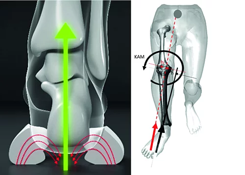Erst 2019 findet sich ein neues biomechanisches Konzept auf dem Markt, das auf die Vermeidung übermäßiger und für die Fortbewegung nicht notwendiger Belastungen des am häufigsten verletzten Kniegelenks sowie des Hüftgelenks und der lumbalen Wirbelsäule abzielt: die sogenannte „Kraftzentrierungstechnologie“ oder „U-TECH“-Technologie. Die Bodenreaktionskräfte werden bei dieser Sohlentechnologie unmittelbar nach der Landung des Fußes sowie während des gesamten Bodenkontaktes unter der Mittelachse des Fußes zentriert und damit in der Frontalebene zentrisch durch Knie- und Hüftgelenk geleitet (Abb. 2 und Abb. 3).